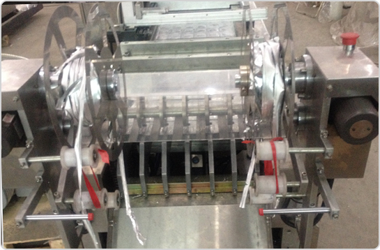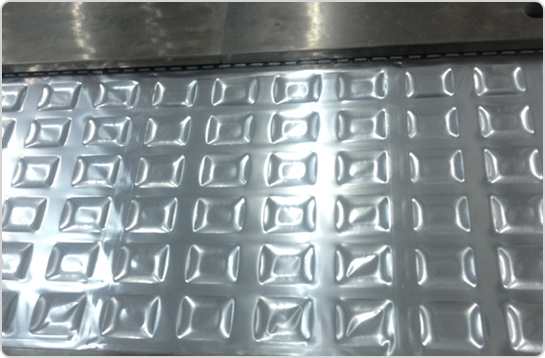 3、設備中部(上膜熱成型區) 只需要將物料擺放好到成型好的格子當中即可,剩下的事情都交給機器了。 |