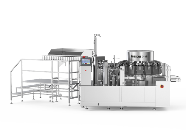 1. 基于BD-8ZK10-130款基礎上進行改良,現一臺機器產能可達到原來兩臺機器產能的效率,包裝速度120包每分鐘,有效提升空間利用率和產能。