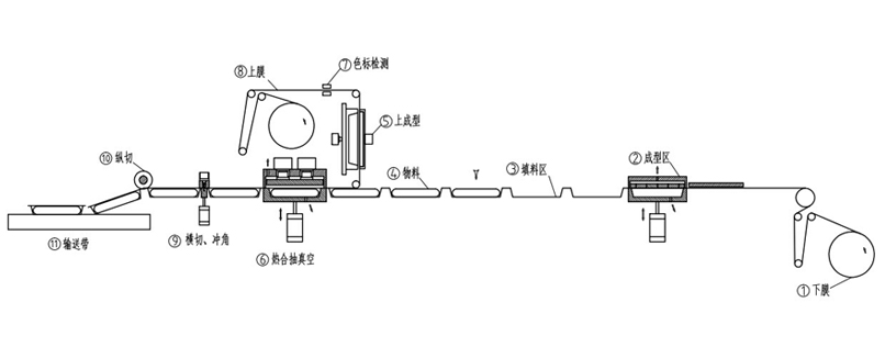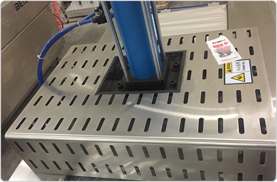 2、設(shè)備前端(上)(成型區(qū)域) 由成型模具和上加熱模具組成,使下膜成型成所設(shè)定形狀。 |